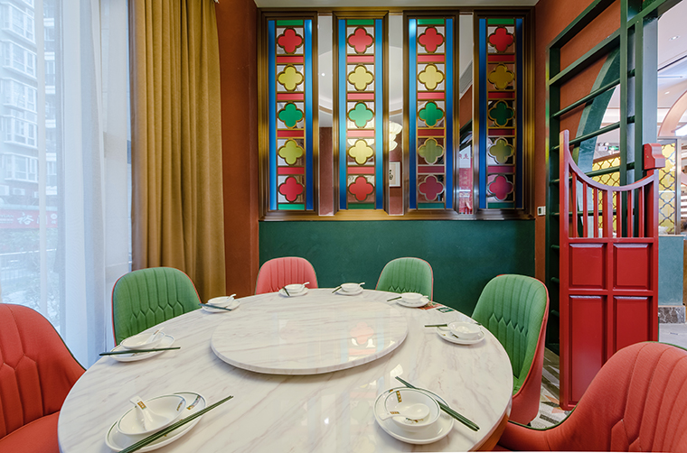餐飲全案設計思維中,餐飲家具設計也是全案設計的一個重要組成部分:比如除了基本的色調(diào)要與品牌主色保持一致之外,家具的款項與品牌之間是否有邏輯關系?家具選用的材料,皮還是布料?既讓顧客坐起來舒服又能與品牌息息相關。我們?nèi)覆邉澰O計的悅得閑廣式點心茶樓,家具顏色就是與整個品牌色調(diào)一致的紅和綠,而家具的座椅靠背的圖案造型則與品牌所要傳達的廣式飲茶文化一脈相承。