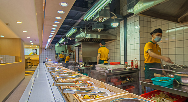 顧客進門洗手,取餐盤自助選菜,找位置就餐,餐具回收,整個動線清晰流暢,運作一氣呵成。選菜臺的設計非常驚艷,30多到菜品排列成一行,在燈光照射,非常有吸引力。讓消費者產生一種想全部吃一遍的沖動,進而胃口大開,長期光顧我們。