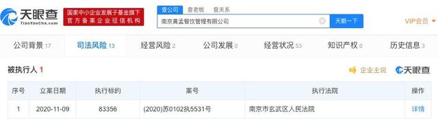 天眼查App顯示,近日,南京黃孟餐飲管理有限公司新增一條被執(zhí)行人信息,執(zhí)行法院為南京市玄武區(qū)人民法院,案號(hào)為(2020)蘇0102執(zhí)5531號(hào),執(zhí)行標(biāo)的83356。據(jù)新京報(bào)報(bào)道,黃磊和孟非共同經(jīng)營(yíng)的火鍋店“黃粱一孟”所屬公司即為南京黃孟餐飲管理有限公司。目前,該店已經(jīng)閉店。此外,今年9月,南京黃孟餐飲管理有限公司發(fā)生工商變更,黃磊退出投資人。