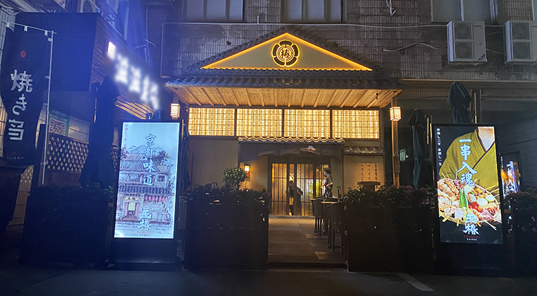 玉椿-燒鳥居酒屋,品深設計在策劃設計時想打造一家江戶時代正宗燒鳥品牌。在門頭設計上采用江戶時代建筑造型,木質門頭頂部凸起的屋檐用三角造型配青瓦和椿字LOGO的家紋。屋檐兩角吊著日式紙燈。屋檐下方搭配透明玻璃方磚,古樸中透露著時尚感。