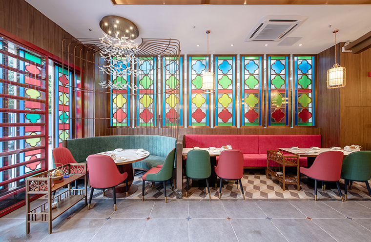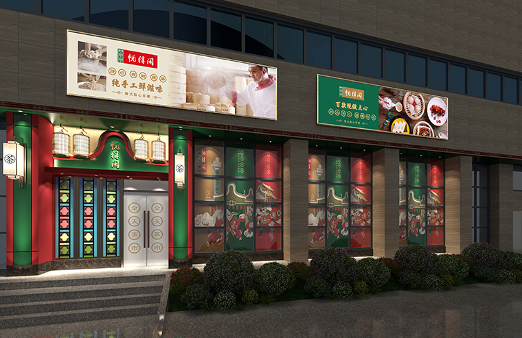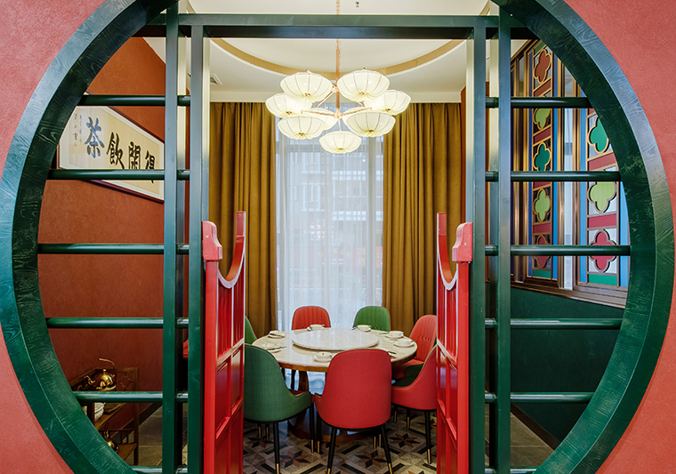 品牌記憶點:嶺南園林鑊耳山墻+西關(guān)廣式花窗+大紅+深綠+玫瑰金
