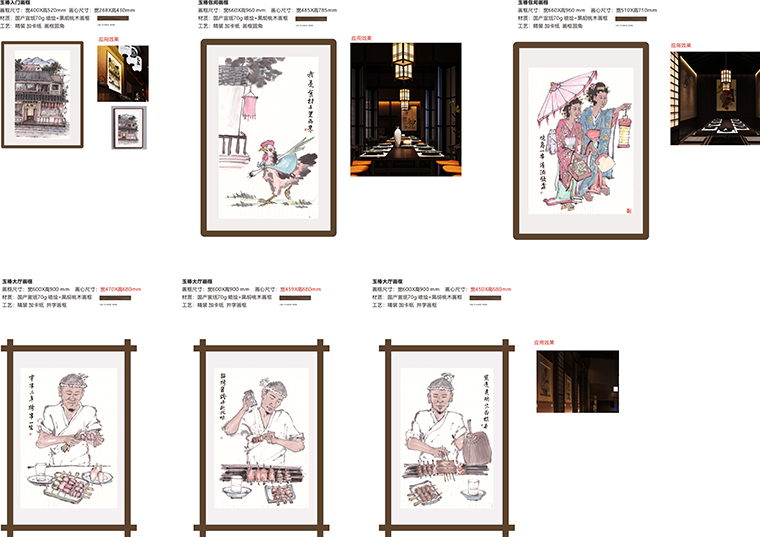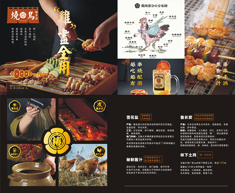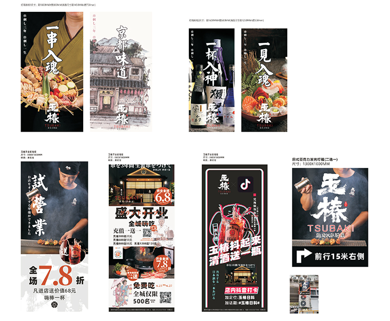 品牌記憶點(diǎn):日本京都風(fēng)格門(mén)頭設(shè)計(jì)+玉椿標(biāo)識(shí)及家徽+燒鳥(niǎo)手繪畫(huà)面+四大主色調(diào)。